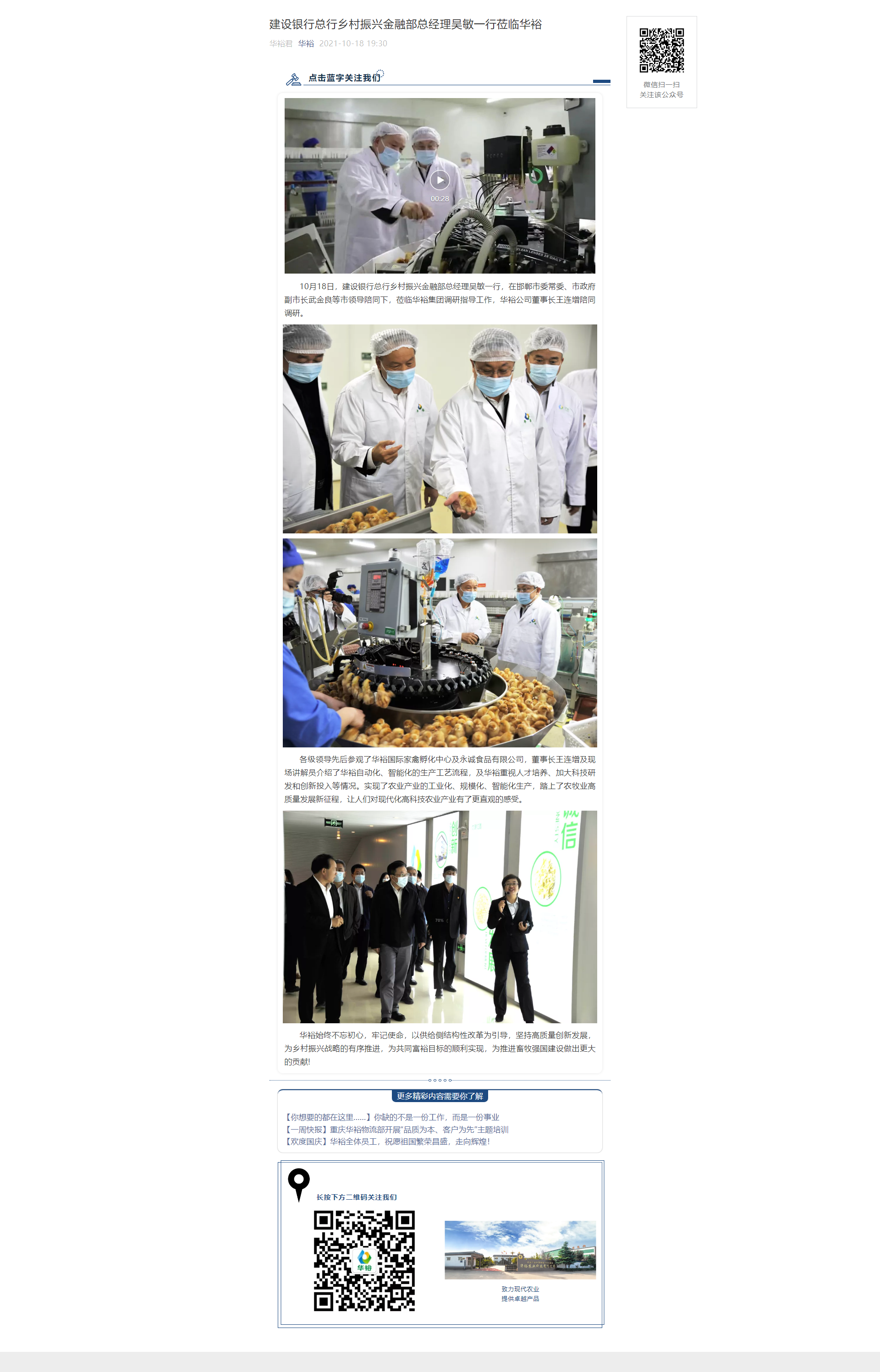 建設銀行總行鄉村振興金融部總經理吳敏一行蒞臨華裕