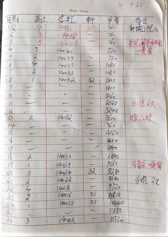 這是2017年9月25日從華裕公司引種海蘭灰14280羽,體重、均勻度良好,30日齡時成活率99.3%,各項生產指標良好。